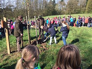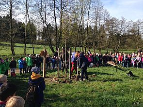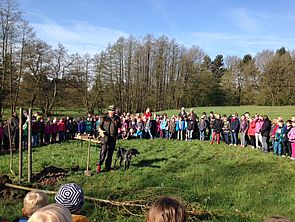 Gespannt sind alle 236 Kinder und Lehrerinnen hinter Herrn Harmel hergelaufen. Endlich kamen wir an der Stelle an, wo unser Baum gepflanzt werden soll.