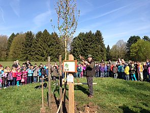Gemeinsam wurde der Baum mit Hilfe von Herrn Harmel, eines Mitarbeiters, Herrn Schnake sowie Kindern und Lehrerinnen gepflanzt. Danach erzählte uns Herr Harmel noch einiges über das Silvaticum, den Feldahorn und die neu angelegte Obstwiese.